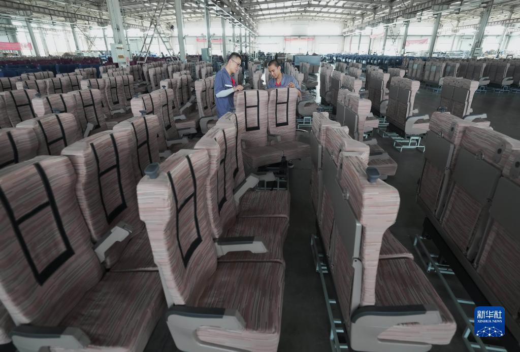 7月1日,工人在河北省唐山市豐潤區一家動(dòng)車(chē)組列車(chē)配件企業(yè)的生產(chǎn)車(chē)間檢查動(dòng)車(chē)組列車(chē)座椅的質(zhì)量。