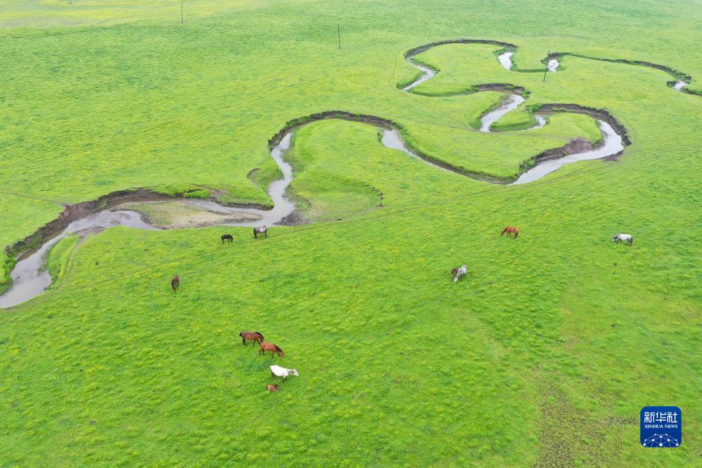 當下,甘肅省定西市岷縣狼渡灘草原水草豐茂,曲折蜿蜒的河流靜靜流淌,岸邊牛羊漫步,原野駿馬馳騁,構成一幅壯美的畫(huà)卷。