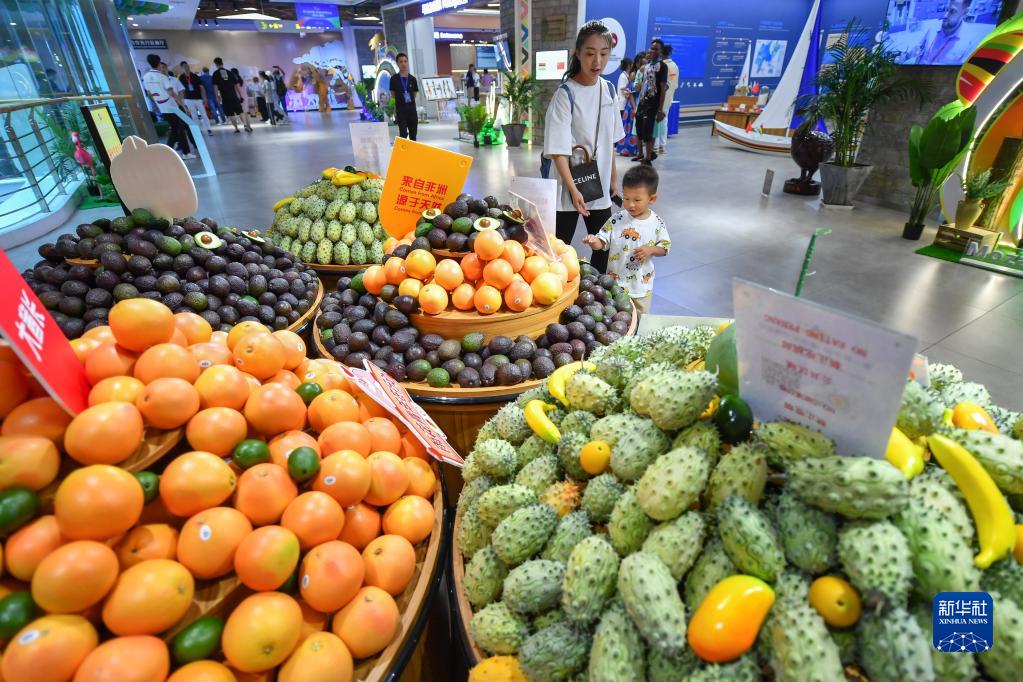 7月1日,在中非經(jīng)貿合作促進(jìn)創(chuàng )新示范園(湖南高橋大市場(chǎng)),家長(cháng)帶著(zhù)小朋友挑選非洲水果。