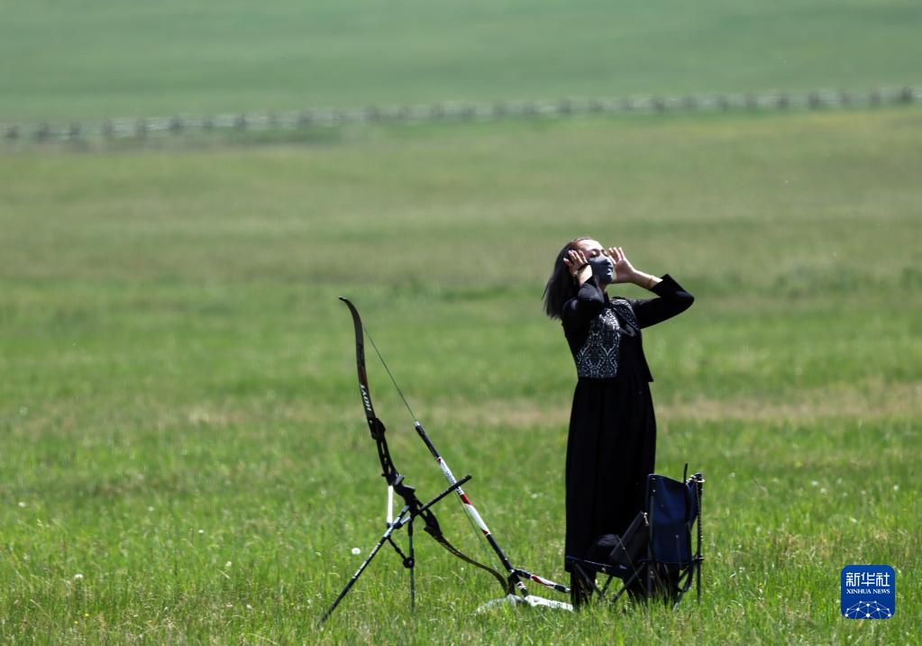 7月1日,一名參加射箭比賽的女選手在賽前整理頭發(fā)。
