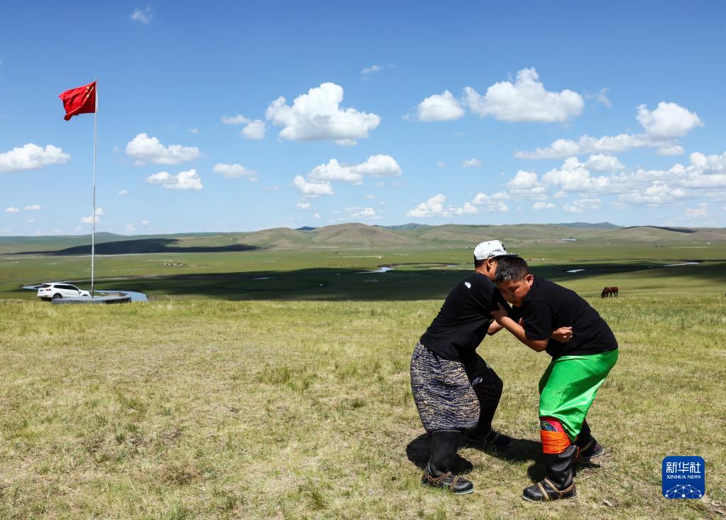 7月1日,參加搏克比賽的小選手們在草地上提前熱身。
