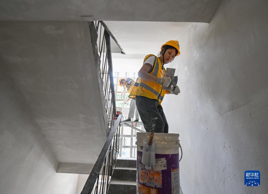 6月30日,在四川省樂(lè )山市市中區海棠街道一處老舊小區改造工地,中建安裝華西公司的工人在樓道內抹灰。