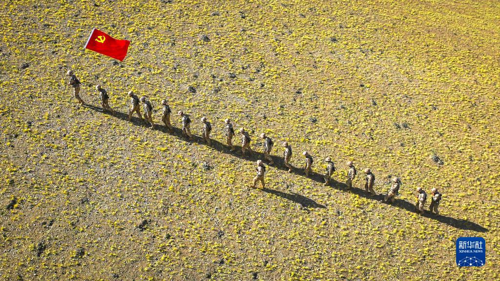 新疆軍區某合成團官兵高擎黨旗在海拔5400米的喀喇昆侖高原巡邏(無(wú)人機照片,6月30日攝)。