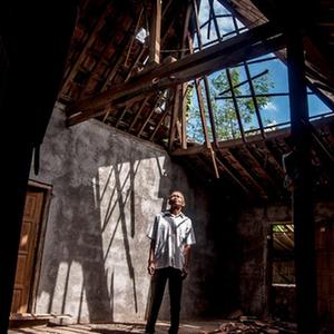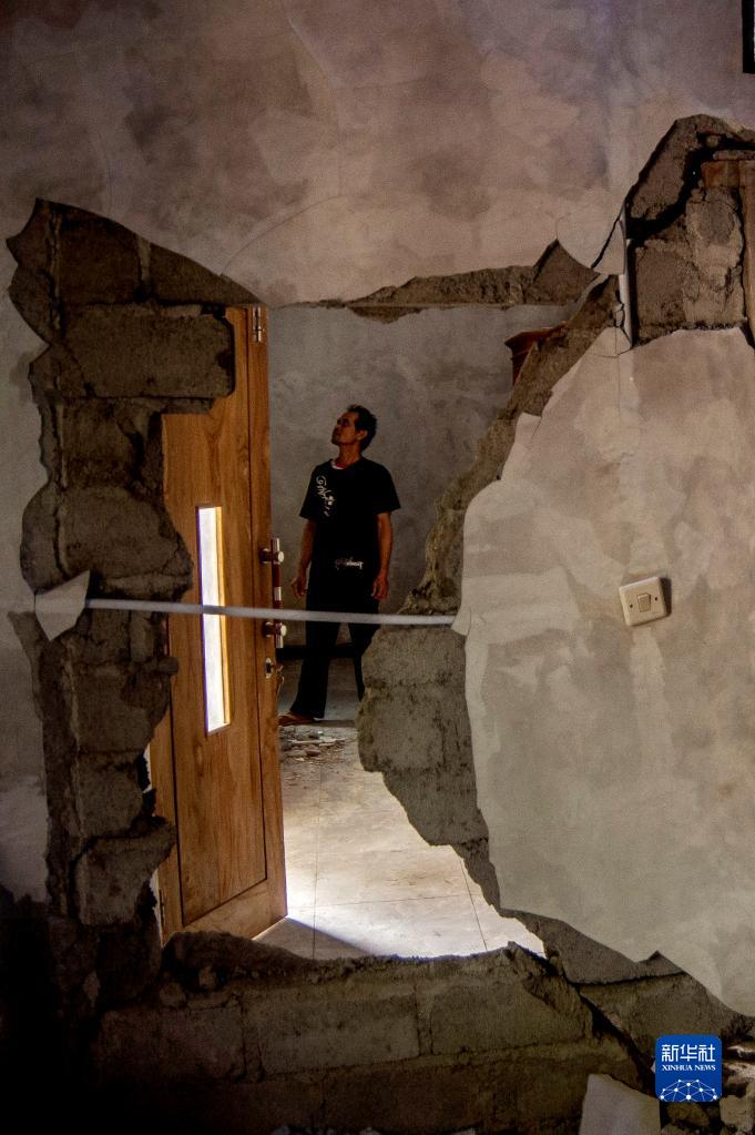 7月1日,在印度尼西亞日惹特區帕卡雷霍村,一名男子站在被地震破壞的房屋內。