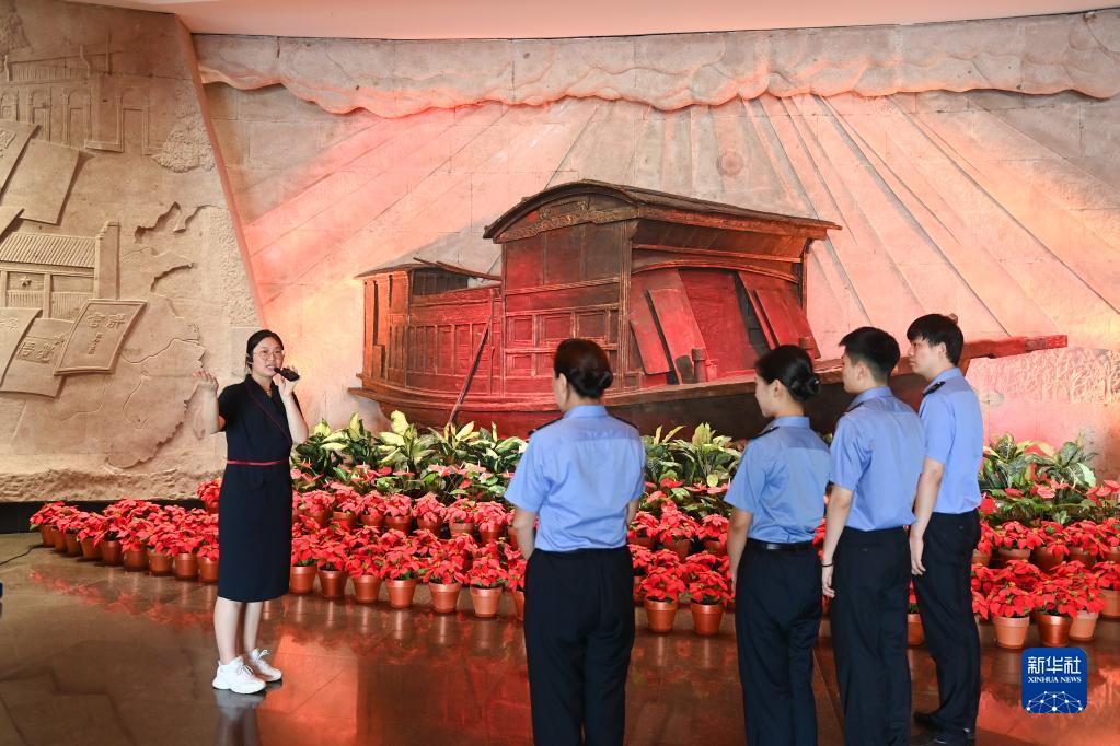 6月30日,南湖革命紀念館講解員(左)為紅色旅游列車(chē)乘務(wù)組黨員代表介紹歷史陳列。