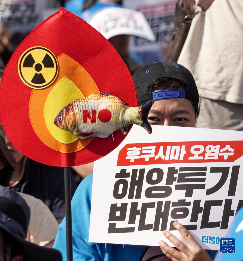 7月1日,民眾手持“反對向海洋排放福島核污染水”字樣的標語(yǔ)在韓國首爾參加集會(huì )。新華社發(fā)(李相浩攝)