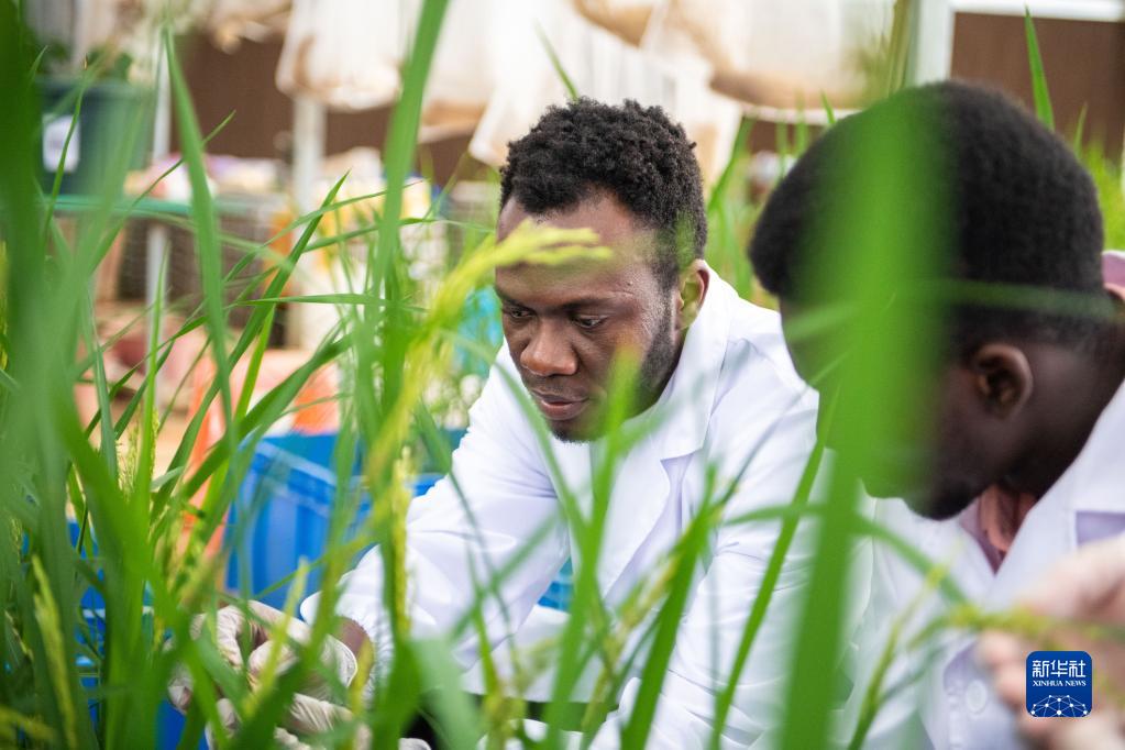 6月26日,尼克(左)和同學(xué)在湖南農業(yè)大學(xué)教學(xué)溫室大棚查看水稻長(cháng)勢。