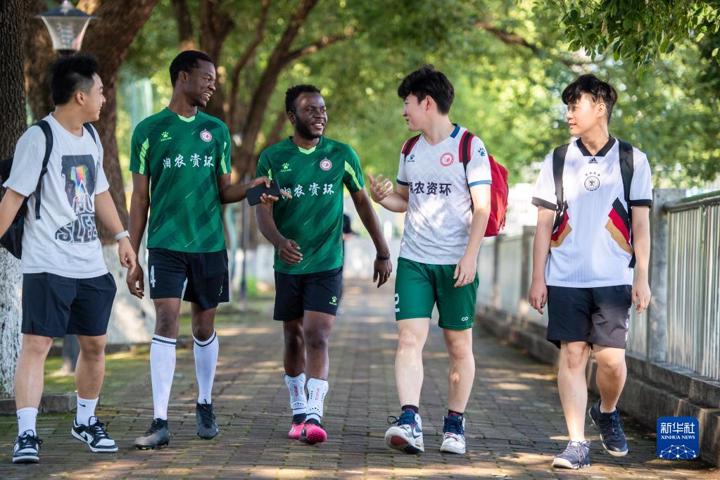 6月26日,在湖南農業(yè)大學(xué)校園,尼克(中)準備和同學(xué)們踢足球。