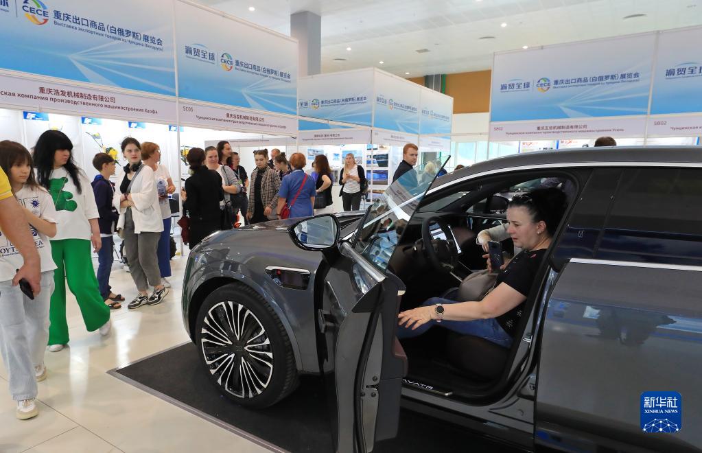 7月1日,在白俄羅斯明斯克中白工業(yè)園,參觀(guān)者在展覽會(huì )上體驗中國生產(chǎn)的電動(dòng)汽車(chē)。