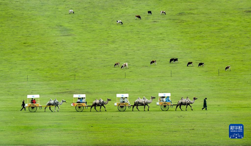 6月29日,游客們在草原上乘坐勒勒車(chē)。