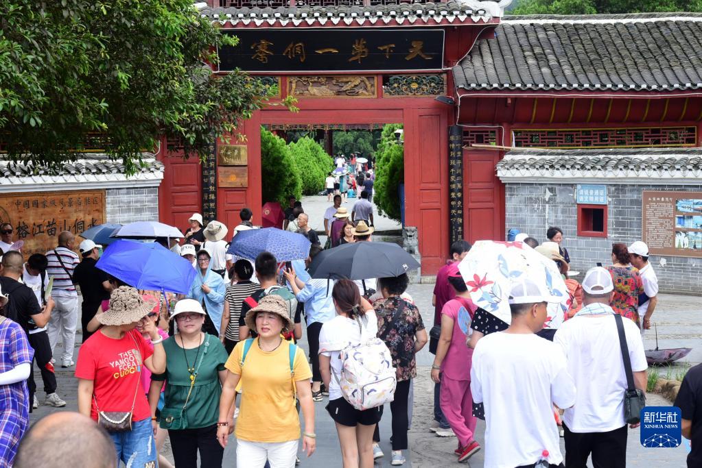 7月2日,游客在貴州省黔東南苗族侗族自治州榕江縣三寶侗寨古榕群景區游玩。