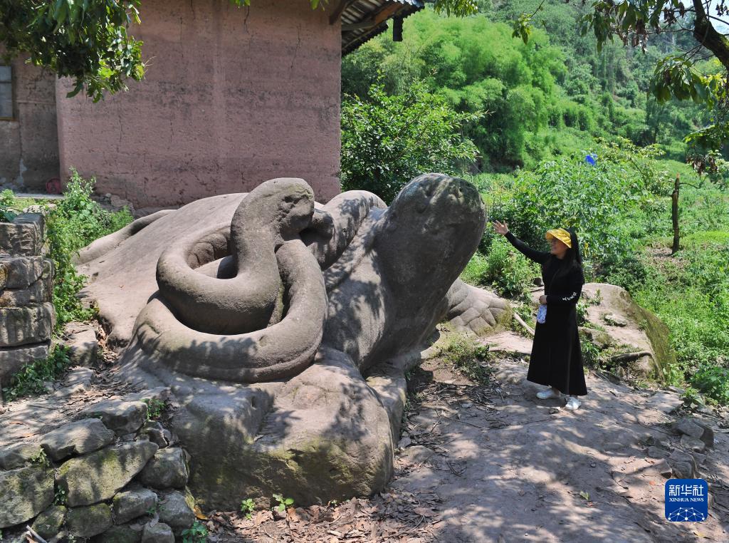 6月27日,當地干部在介紹神臂城內的蛇盤(pán)龜玄武石刻。石龜周長(cháng)20米,背高1.88米,龜背上纏著(zhù)一條長(cháng)21.5米的大蟒蛇,用天然整石雕鑿而成。