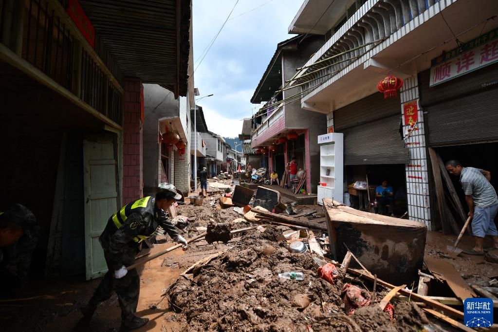 7月2日,在湖南省湘西土家族苗族自治州古丈縣巖頭寨鎮草潭村,當地應急民兵協(xié)助村民清理淤泥和垃圾。