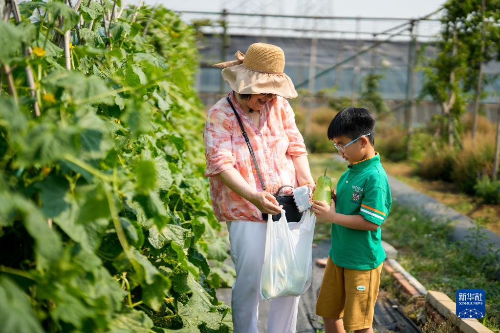 7月3日,家長(cháng)帶著(zhù)孩子在河北省唐山市路北區一處家庭農場(chǎng)內采摘。