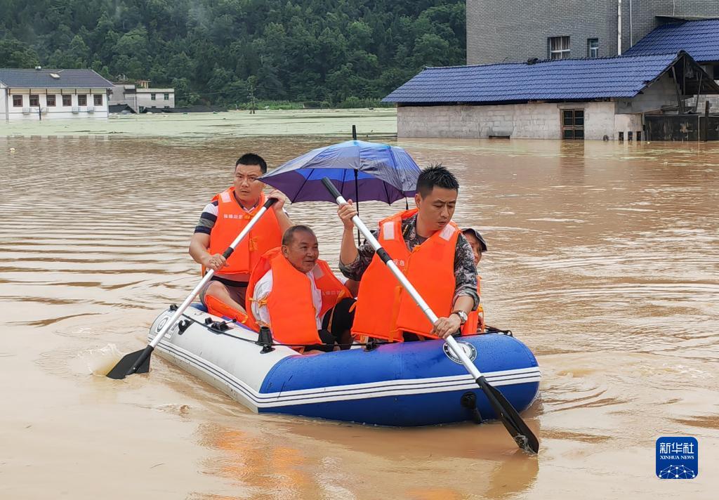 6月30日,在保靖縣陽(yáng)朝鄉猛科村,當地應急民兵利用皮劃艇轉移被困村民。