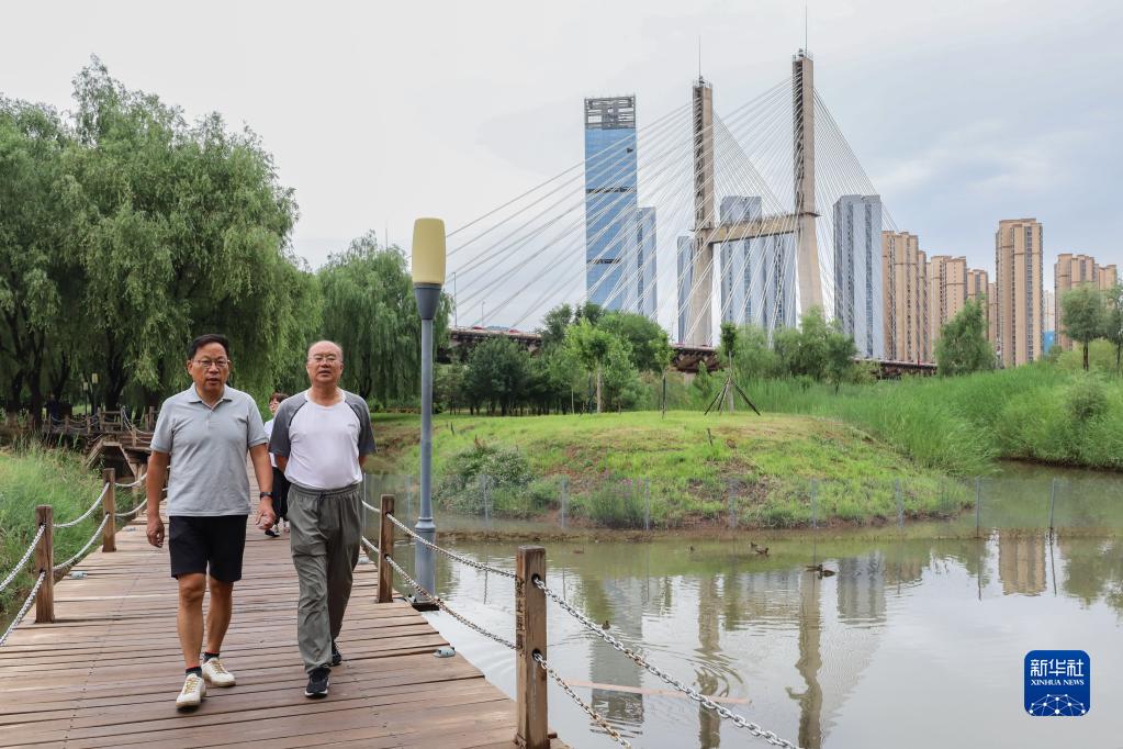 7月3日,在甘肅省蘭州市安寧區,市民在銀灘濕地公園散步。