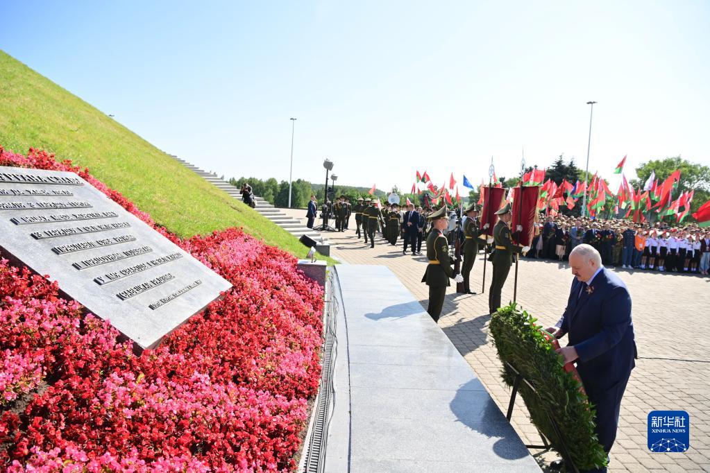 7月3日,白俄羅斯總統盧卡申科在明斯克郊外的光榮崗紀念碑前敬獻花圈。