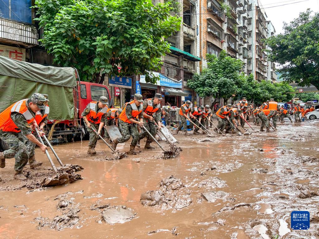 7月4日,在重慶市萬(wàn)州區五橋街道,武警重慶總隊執勤第三支隊官兵在清理街道淤泥。