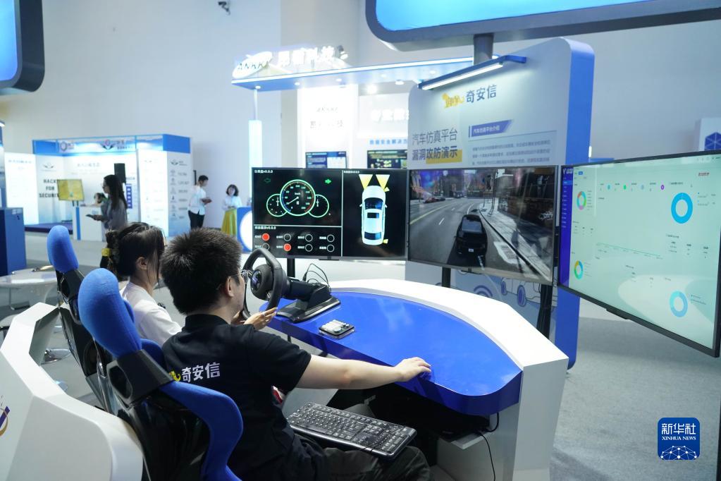 7月4日,在2023全球數字經(jīng)濟大會(huì )精品主題展現場(chǎng),工作人員(右)進(jìn)行汽車(chē)仿真平臺漏洞攻防演示講解。