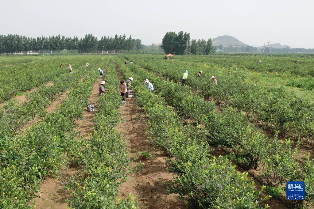 7月5日,河北省灤州市東安各莊鎮三山院村的農民在田間采摘藍莓(無(wú)人機照片)。