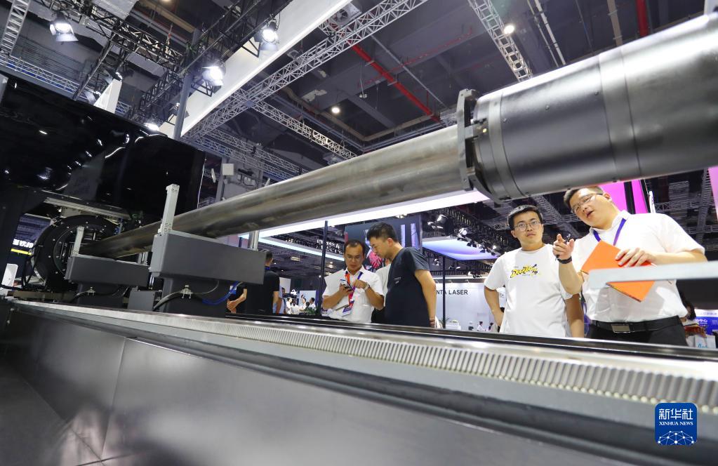 7月5日,展方工作人員(右)在一臺激光切管機邊向參觀(guān)者做介紹。
