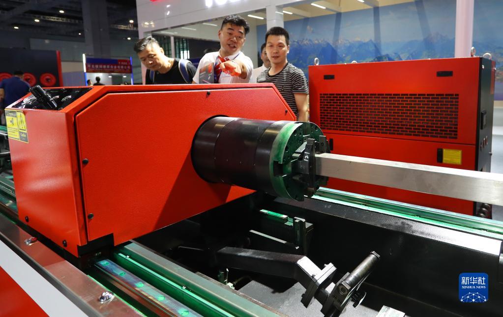 7月5日,展方工作人員(中)向參觀(guān)者介紹一臺光纖激光切管機。