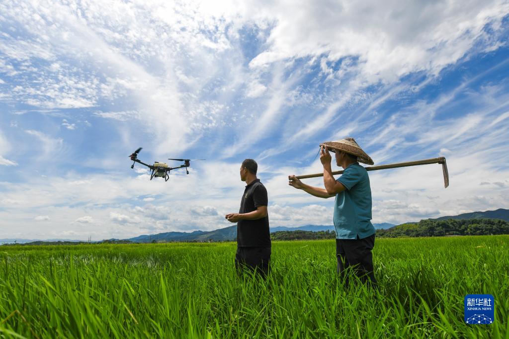 7月5日,在湖南省常寧市洋泉鎮坦沖村,農技員操作植保無(wú)人機進(jìn)行飛防作業(yè)。