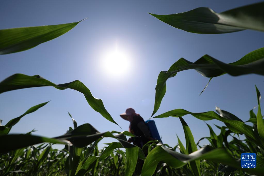 7月5日,山東省臨沂市郯城縣郯城街道農民在玉米田間勞作。