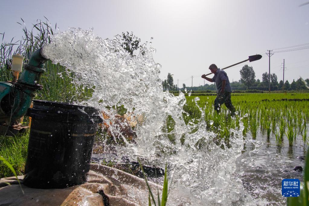 7月5日,農民在山東省淄博市高青縣蘆湖街道大蘆家村為水稻田澆水。