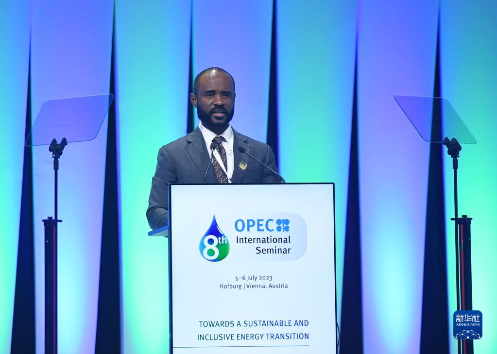 7月5日,在奧地利維也納,歐佩克輪值主席、赤道幾內亞礦產(chǎn)與石化部長(cháng)安東尼奧·奧布羅·翁多在第八屆歐佩克國際研討會(huì )上致辭。