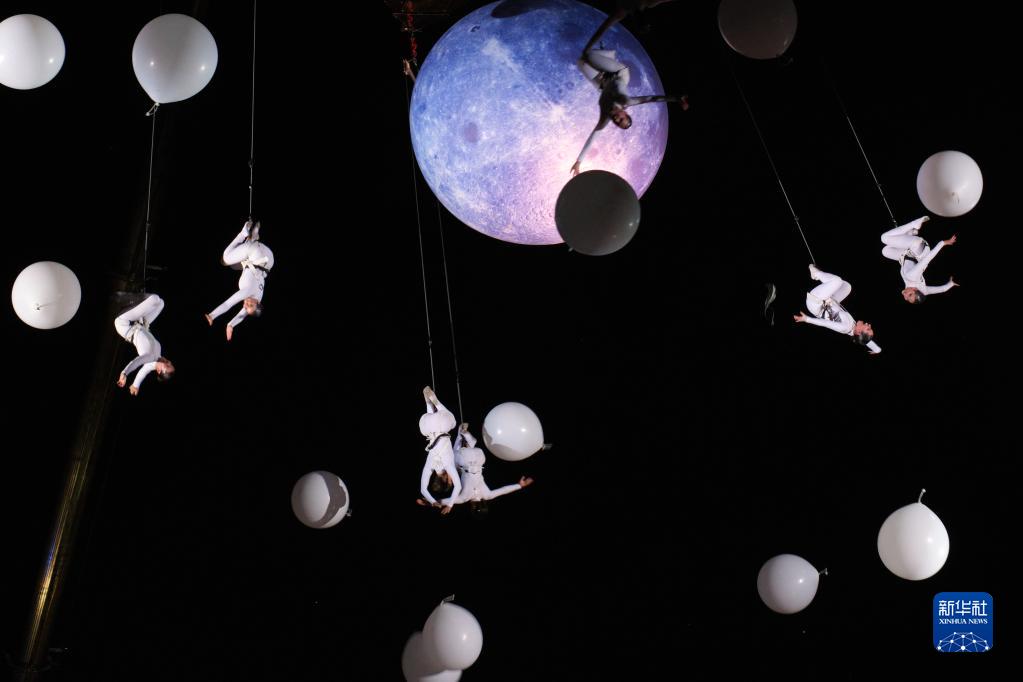 7月5日,舞蹈演員在西班牙馬德里“城市之夏”藝術(shù)節上表演“空中芭蕾”。