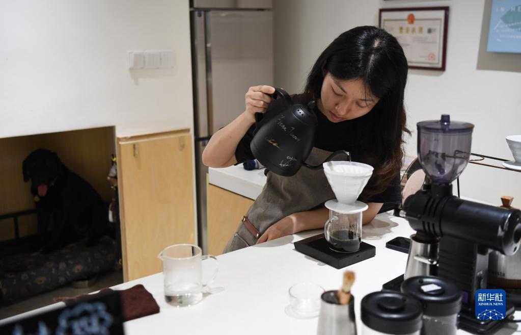 7月5日,在廣州市白云區的手心咖啡店,視障咖啡師陳柳曉在制作手沖咖啡。