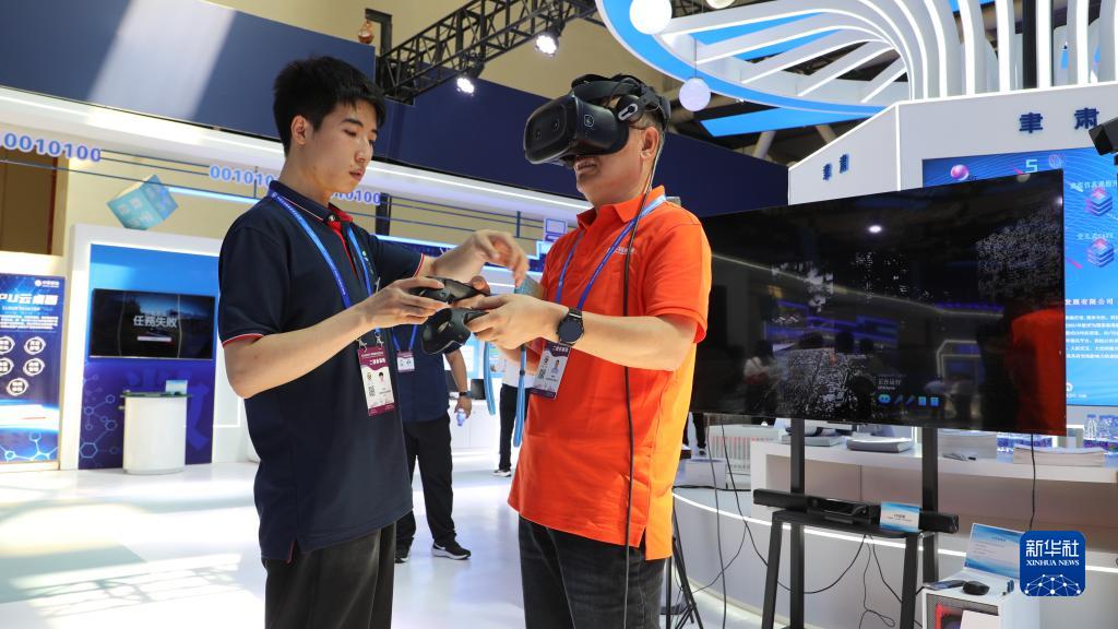 7月6日,在第二十九屆中國蘭州投資貿易洽談會(huì )電子科技館,參展商引導參會(huì )者體驗VR產(chǎn)品。