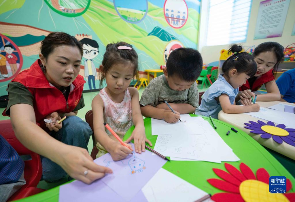 7月6日,在黃驊市海濱學(xué)院社區“多彩暑期·向陽(yáng)花開(kāi)”公益課堂,志愿者教孩子們畫(huà)畫(huà)。