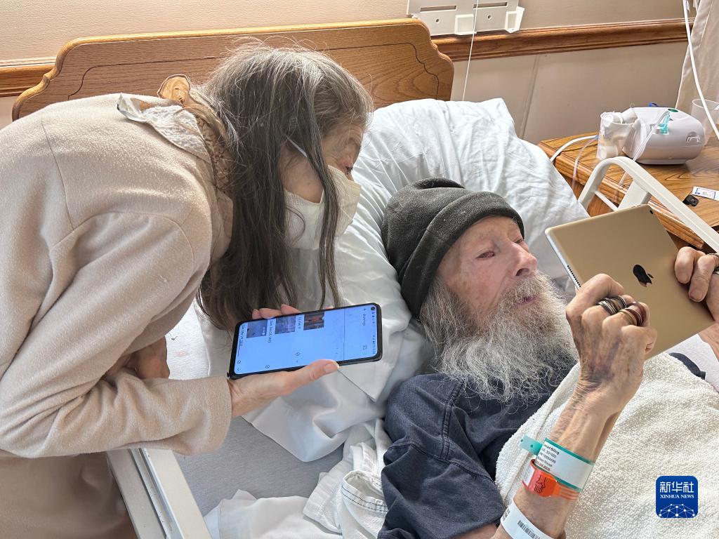 7月2日,103歲的美國老人林恩·柏齡(右)在其家附近的康養中心病床上,以視頻連線(xiàn)的方式“重回”了他魂牽夢(mèng)繞87年的鼓嶺。新華社記者 楊士龍 攝