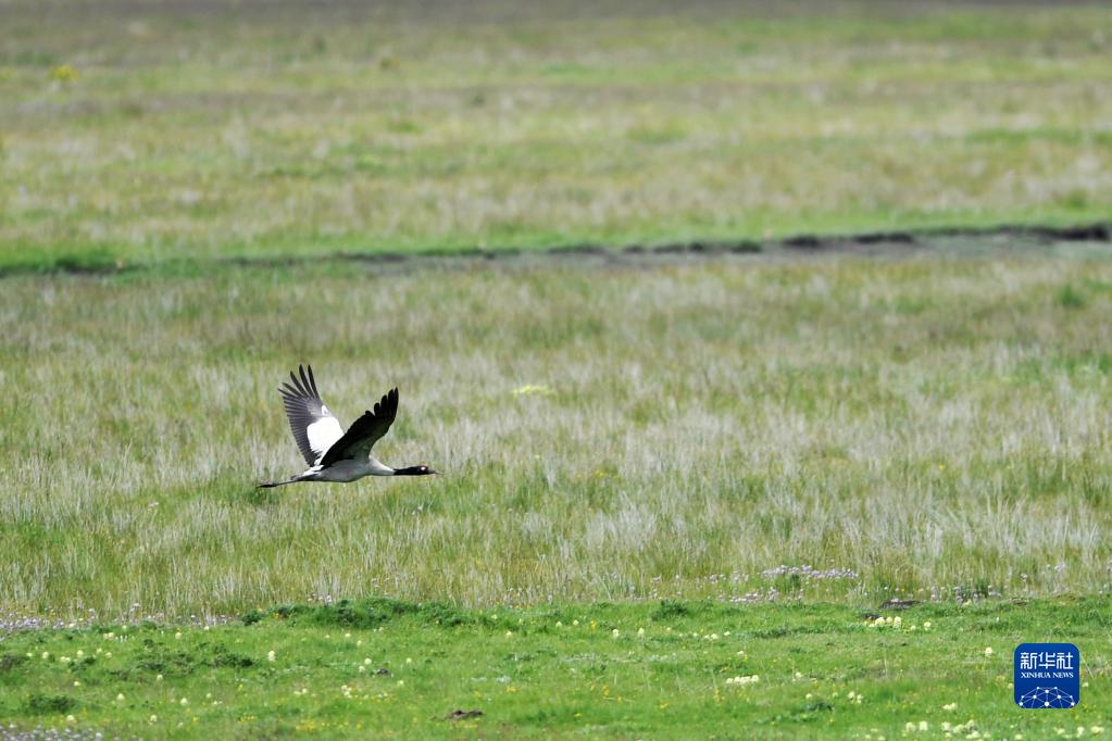 一只黑頸鶴在瑪曲的濕地草原上飛翔(7月6日攝)。