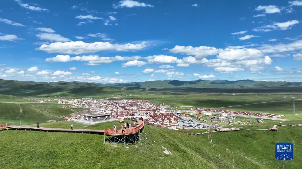 游客在甘南藏族自治州瑪曲縣阿萬(wàn)倉濕地的觀(guān)景平臺上游覽(7月6日攝,無(wú)人機照片)。