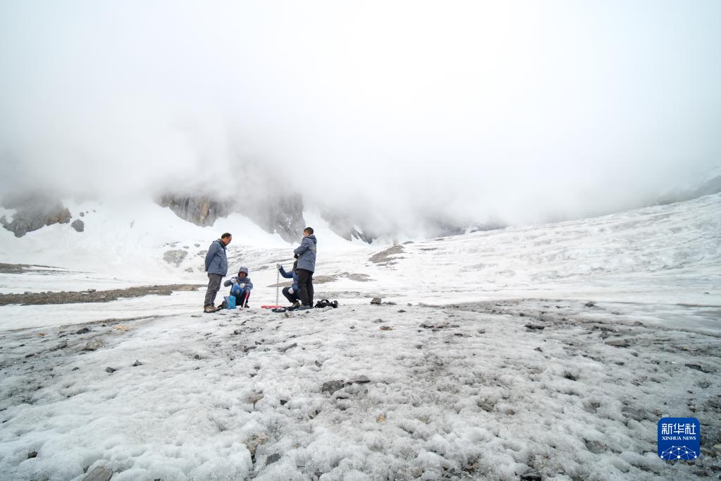 玉龍雪山站站長(cháng)王世金(左一)和團隊成員在白水河1號冰川冰面打鉆(6月19日攝)。