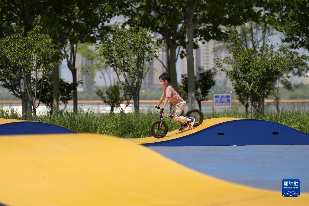 7月7日,小朋友在河北省遷安市灤河沿岸一個(gè)親子游樂(lè )場(chǎng)游玩。