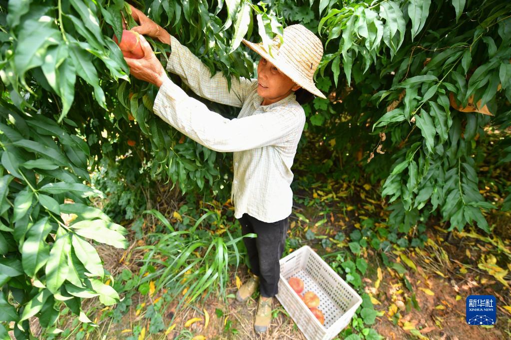 7月7日,在臨湘市聶市鎮乘嶺社區的涓湖果園,果農在采摘蟠桃。