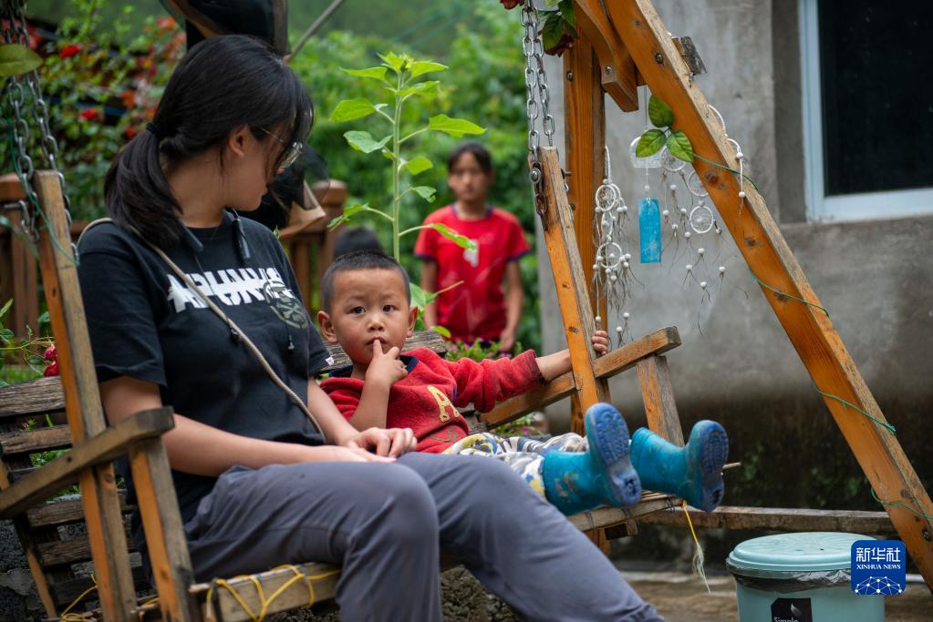 7月5日,志愿者李苗恩(左)陪秋那桶村的小朋友在“半山花語(yǔ)”書(shū)屋的院子里玩耍。新華社記者 徐嘉懿 攝
