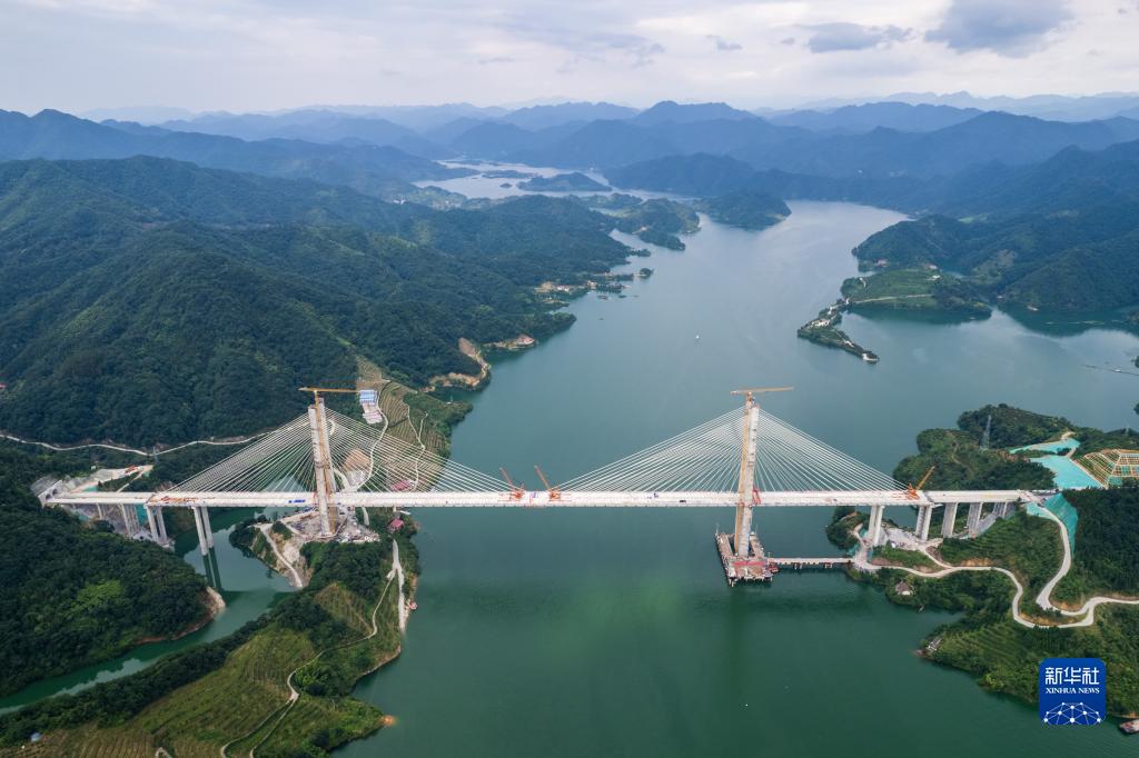 這是7月7日在湖南省益陽(yáng)市安化縣拍攝的官新高速雪峰湖大橋施工現場(chǎng)(無(wú)人機照片)。