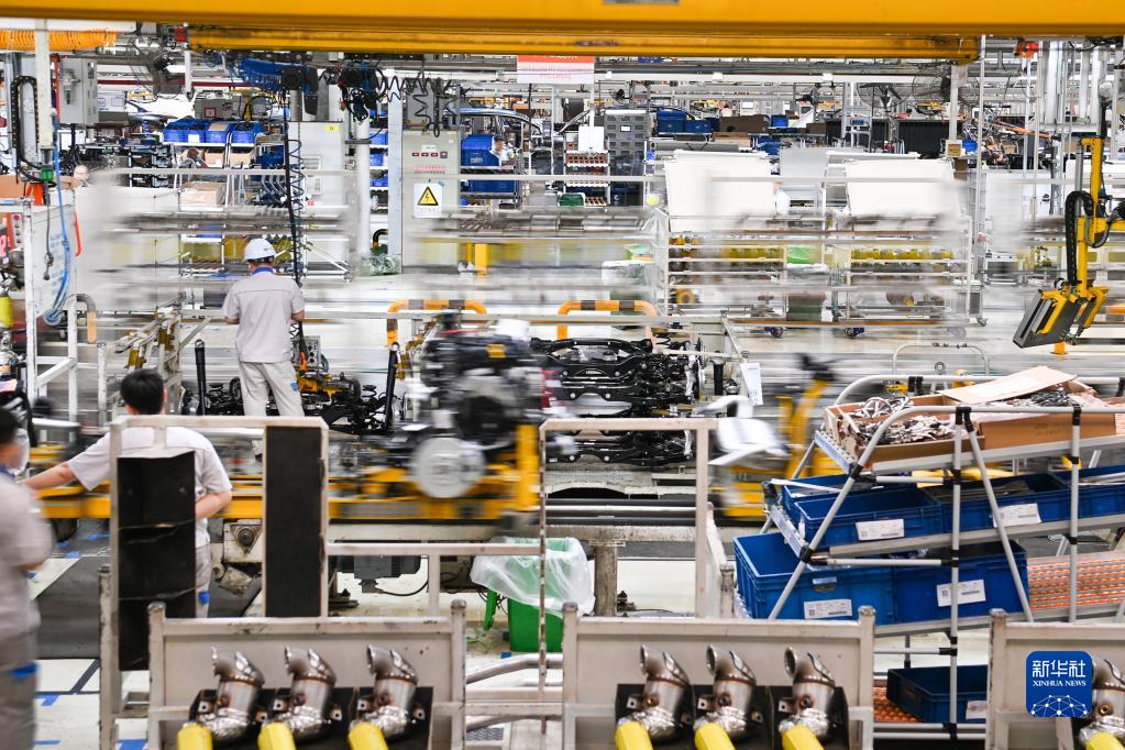 在位于吉林長(cháng)春的一汽-大眾長(cháng)春生產(chǎn)整車(chē)制造二部總裝二車(chē)間,工人在生產(chǎn)線(xiàn)上裝配車(chē)輛(6月12日攝)。