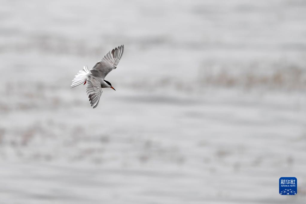 一只燕鷗在尕海濕地上飛翔(7月7日攝)。