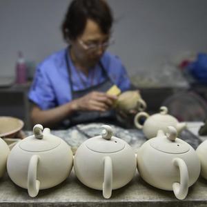 7月7日,工作人員在河南省汝州市玉松汝瓷有限公司的車(chē)間里制作汝瓷產(chǎn)品。