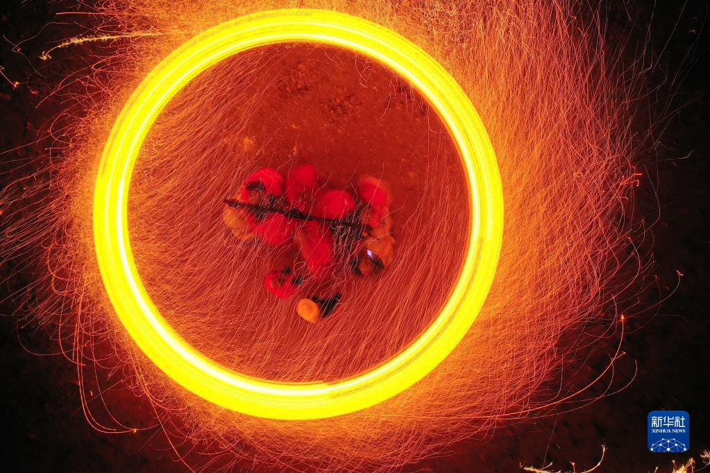 7月5日,河北省灤平縣火斗山鎮大店子村的民間藝人在表演“掄花”(無(wú)人機照片)。