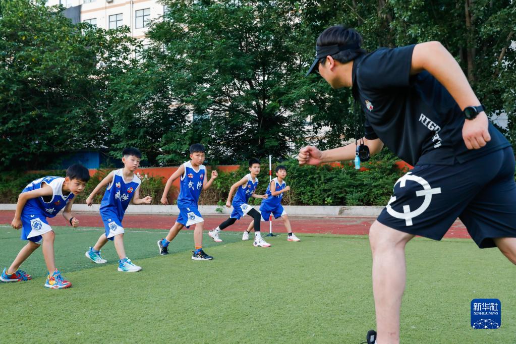 7月7日,在河南省焦作市武陟縣一家體育培訓機構,教練指導學(xué)生練習跑步。