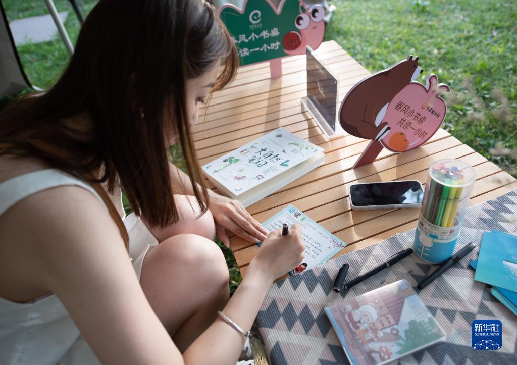 7月8日,在銀川市森林公園,讀者寫(xiě)下閱讀感想。