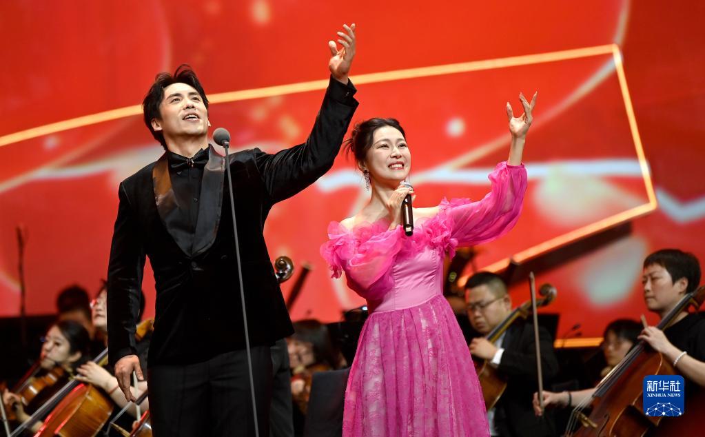 7月8日,在西安“感悟初心?與黨同行”經(jīng)典歌曲交響音樂(lè )會(huì )現場(chǎng),演唱者洪之光(左)、常思思在演唱歌曲《不忘初心》。