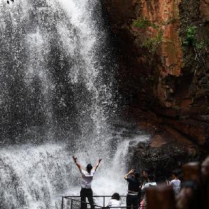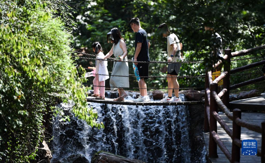 7月9日,游客在新密市伏羲山大峽谷內游玩。
